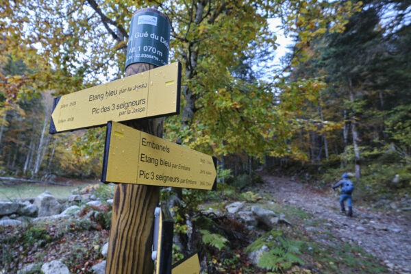 Restez a droite et montez a la cabane d’Embanels. A la sortie de la forêt magnifique vue sur la face Nord du Pic des 3 seigneurs. Lieu d’estive a traverser pensez à tenir votre chien en laisse. Vous laissez la cabane sur votre droite et franchissez sur une ancienne passerelle le torrent. Clairière Alt 1180m